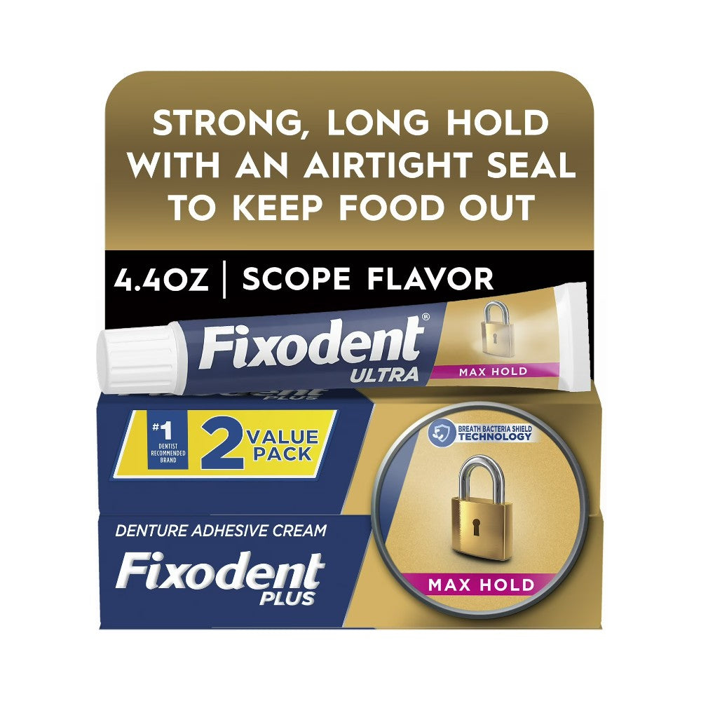 Fixodent Ultra Max Hold Secure Denture Adhesive Cream delivers the strongest hold in the Fixodent line-up, keeping your dentures securely in place all day long. This powerful denture glue provides superior retention compared to Fixodent Original, so you can eat and speak with confidence.