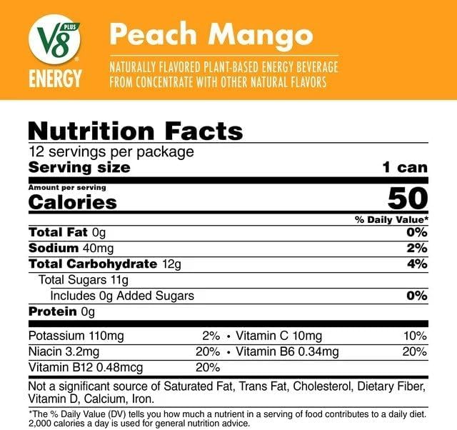 V8 +ENERGY Peach Mango Energy Drink gives you the plant-based energy you need to get the most out of your day. Infused with sweet peach and tropical mangos, this energy drink features a blend of juices, plus steady energy from black tea and green tea gives you roughly the same amount of caffeine as a cup of coffee and other caffeinated drinks. Non-GMO, gluten-free V8 energy drinks are made with no added sugar*, no high fructose corn syrup. Each 11.5 fl oz serving of this caffeine drink contains one plus a combined serving of vegetables and fruit, and it's an excellent source of B vitamins. Enjoy a V8 energy drink for breakfast, or take this energy drink on a busy day out. V8 +ENERGY drinks can be a delicious workout drink. These V8 +ENERGY drinks can be enjoyed chilled or at room temperature. In addition to Peach Mango, V8 +ENERGY energy drinks are also available in Wild Berry, Strawberry Banana and other delicious flavours. For steady energy with a lightly carbonated twist, try sparkling V8 energy drinks. *Not a low-calorie food - see nutrition facts panel for full sugar and calorie content